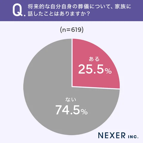 アンケートの結果、25.5%の方がすでに家族と葬儀について話をしたことがあると答えています。一方で、約7割の方はまだ家族に話したことがなく、葬儀に関する話題は日常ではなかなか口にしづらいテーマであることがうかがえます。